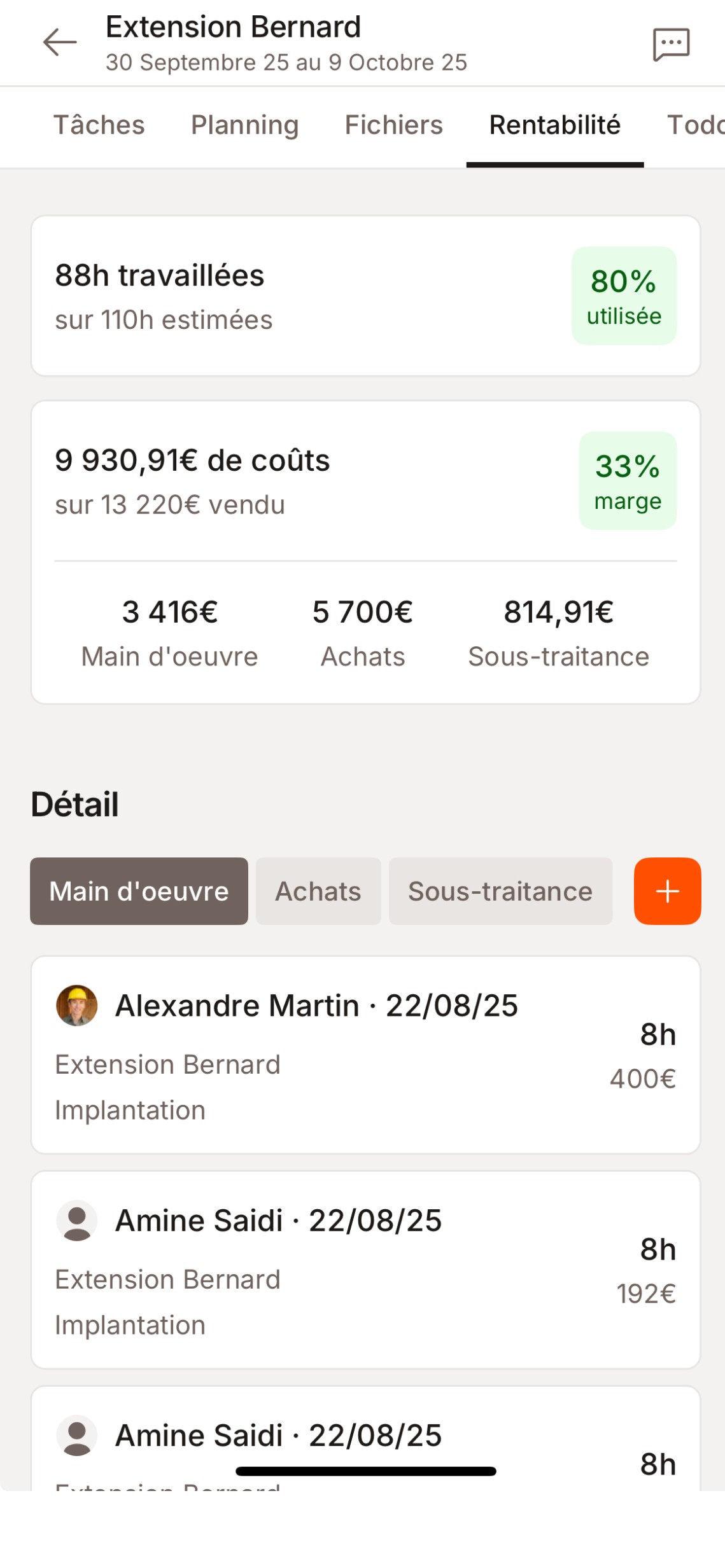 Très bonne application de gestion de chantiers ! Nous l'utilisons depuis 1 mois avec mon équipe de 15 personnes et nous sommes tous satisfaits. Plus aucune feuilles d'heures volantes, tout est centralisé, je peux connaître la rentabilité des mes chantiers.