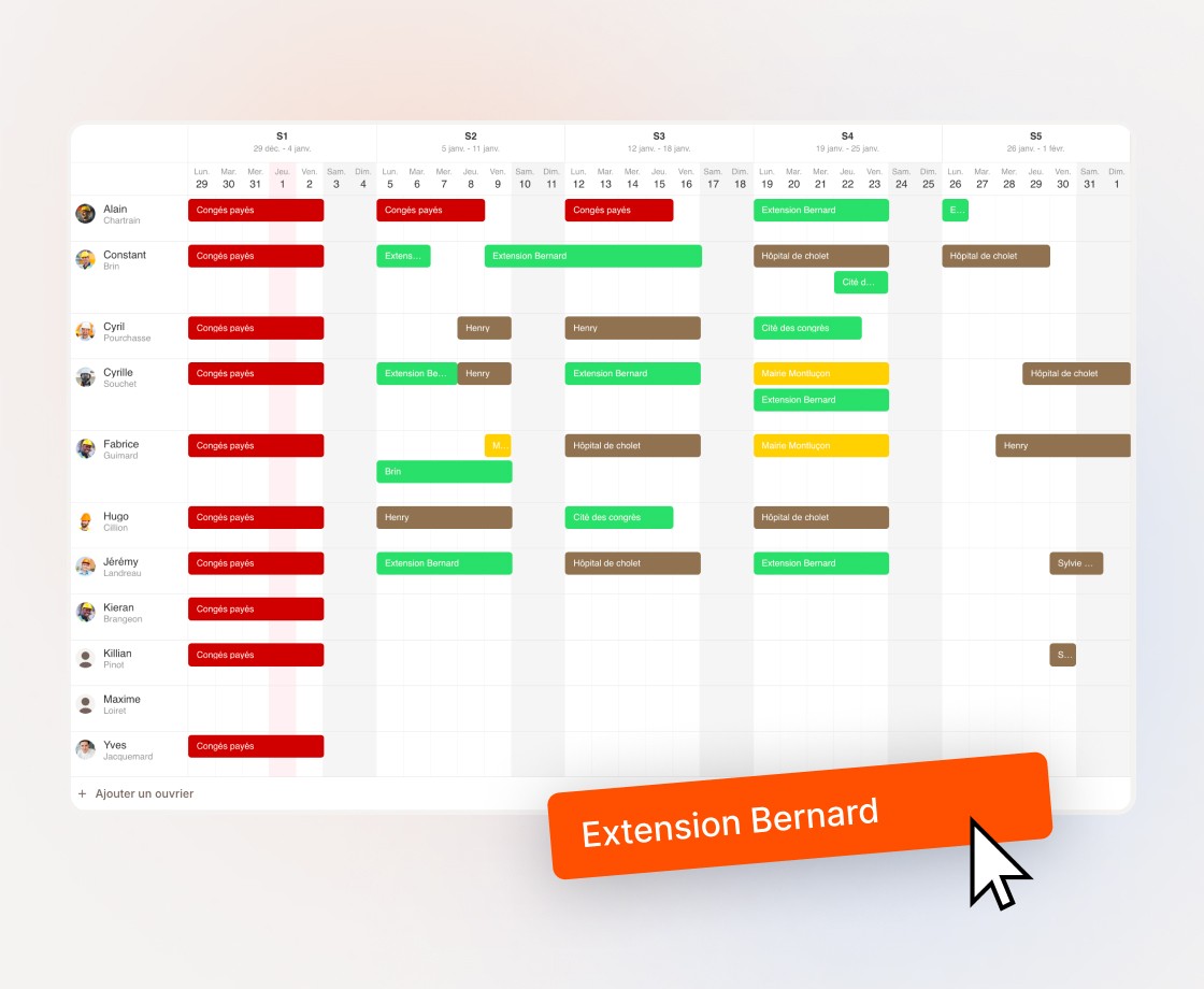 Cloisonnement d'un plateau de bureaux, doublage isolant d'une maison, faux plafond dans un commerce, rénovation d'appartement... Visualisez tous vos chantiers et répartissez vos plaquistes selon leur disponibilité et les phases de travaux.