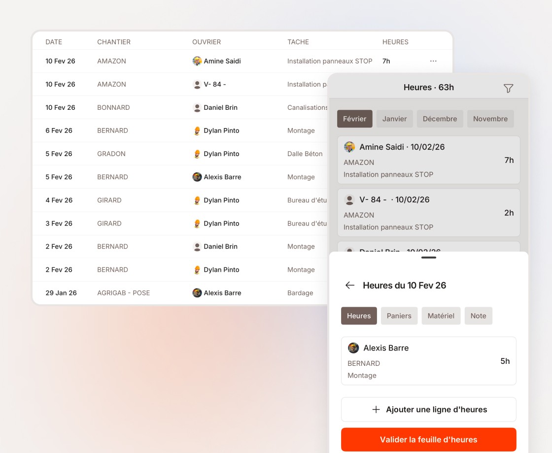 Plus de feuilles d'heures qui traînent avec les chutes de plaques et les sacs de vis. Vos compagnons plaquistes saisissent leurs heures directement depuis leur téléphone entre deux plaques. L'interface a été conçue pour être utilisable facilement sur le terrain.