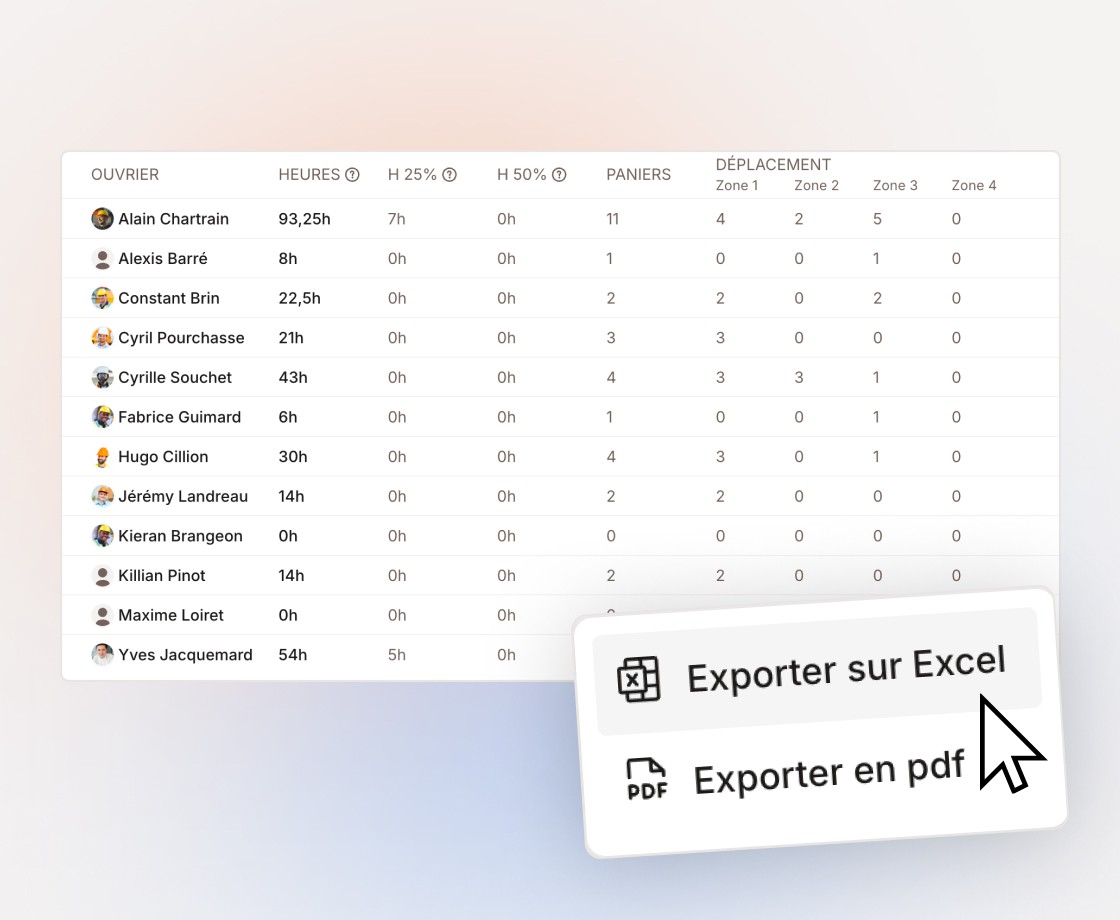 Export Excel ou PDF en un seul clic, prêt pour votre gestionnaire de paie